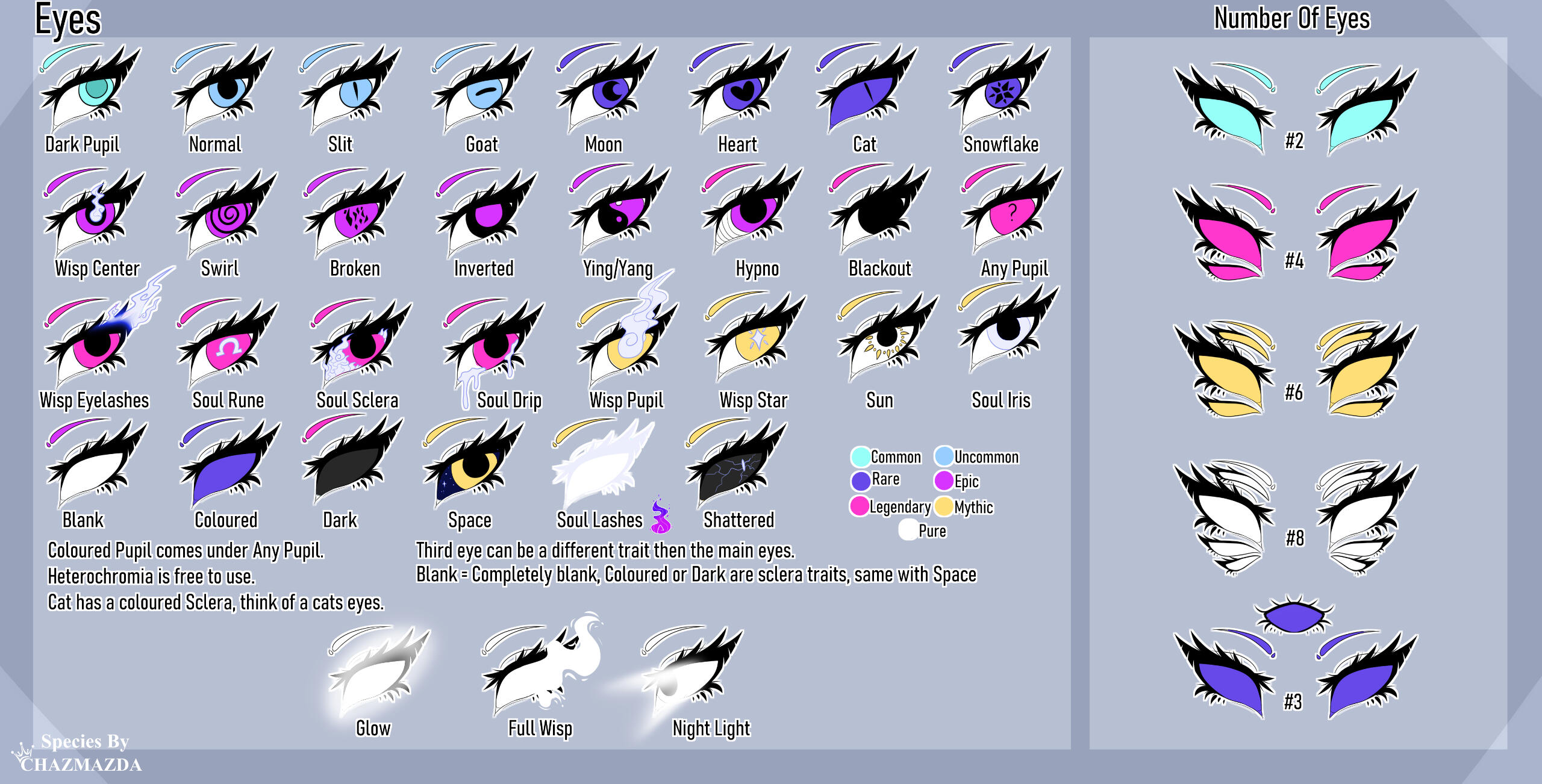 ・❥・Dark Pupils are just a darker colour of the iris.・❥・Blank = No eyes.・❥・Coloured, Dark and Space are sclera traits.・❥・3rd eye of the rare 3rd eye trait can be a different trait then the main two. ONLY that trait can be different.・❥・Cat eye has a coloured sclera, Imagine it as a Cats eye. It can be any colour.・❥・Coloured Pupil is a Any Pupil trait [Legendary Trait]・❥・Heterochromia is a free trait to use as its naturally found in nature.