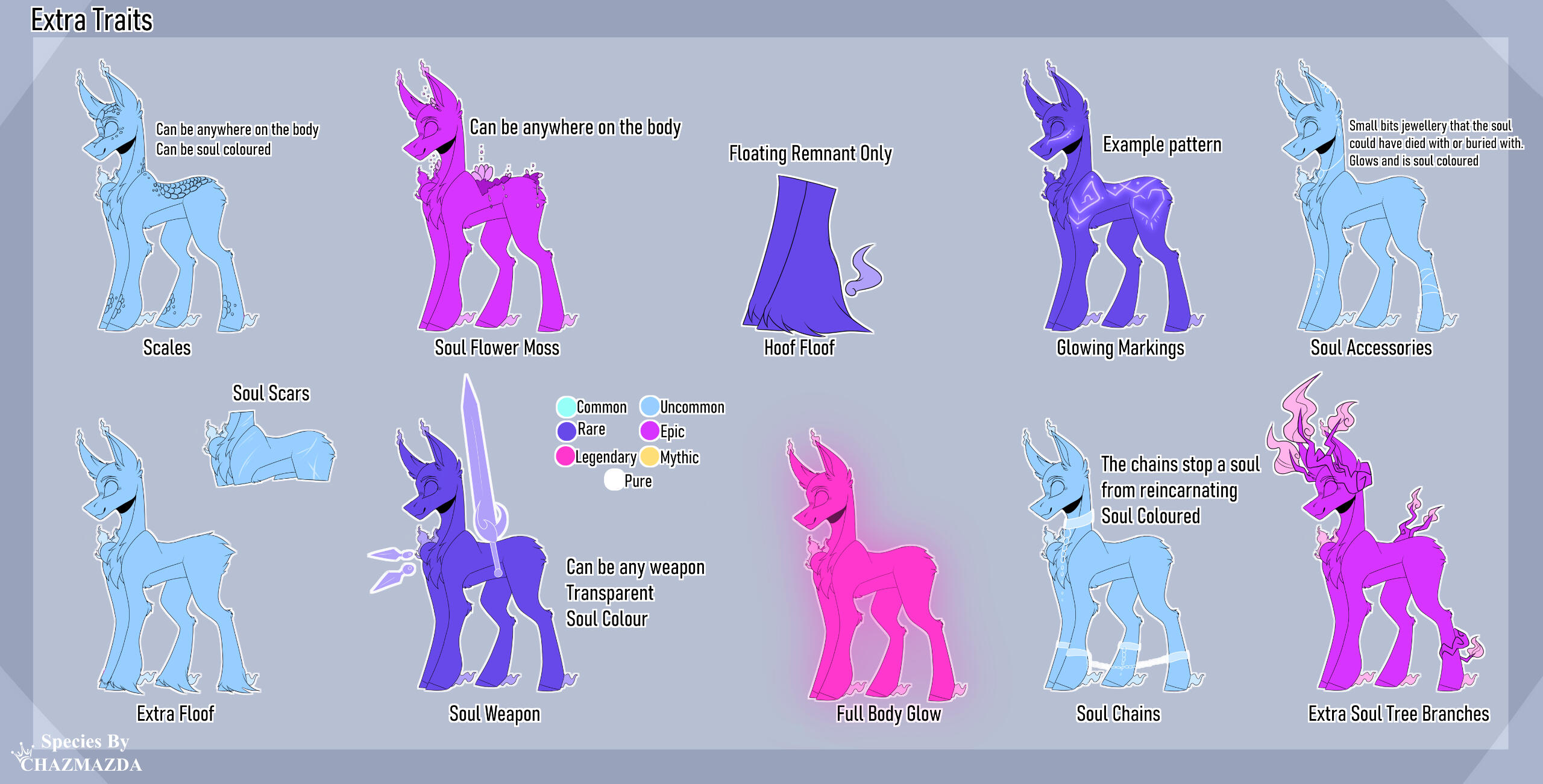 ・❥・These traits can only be obtained via MYO, custom or rights.・❥・Feathers can be any shape and size. They can be soul coloured and can emit remnant.・❥・Floating horns are not always 2 horns! are soul coloured.・❥・Multiple souls, they can all be different souls. You must write the extra souls traits in when waiting approval!・❥・Soul Robe can be taken off, when taken off the remnant dissipates, only when its back on the pony does it reactivate.・❥・Floating rune stones can be placed anywhere on the body, they can also emit remnant.
