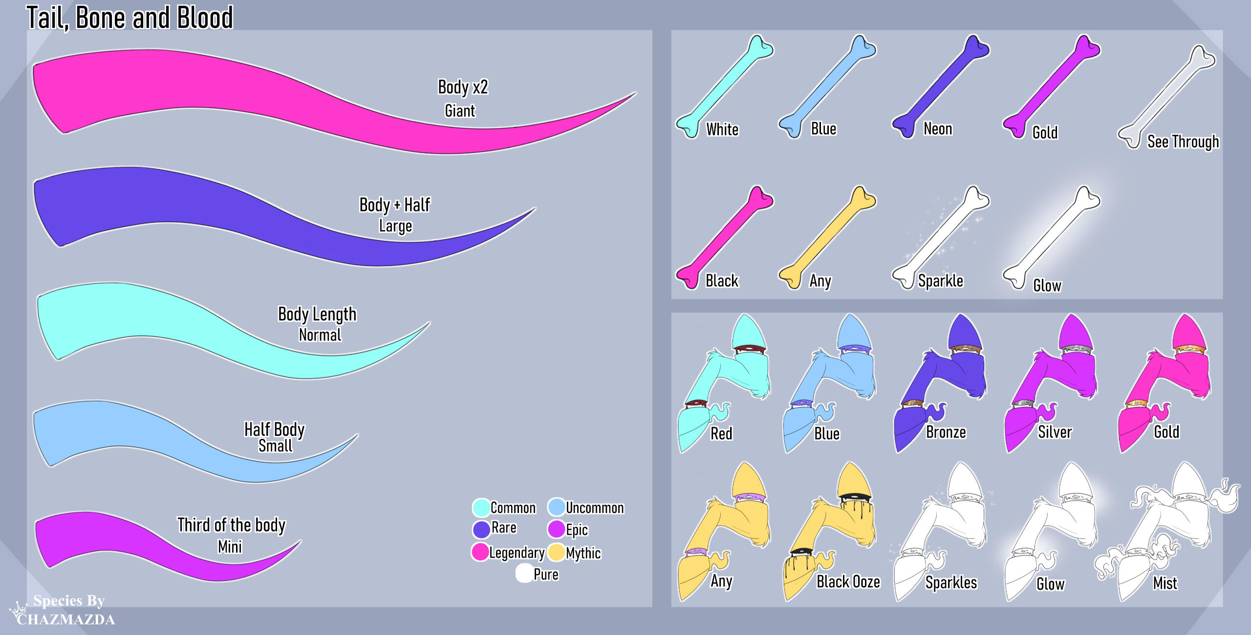 ・❥・Bronze, Silver and Gold blood types have a shine to them as they are metallic.・❥・Blue and red can be any shade of those colours.・❥・Black ooze is sticky and will stick to anything.Bone