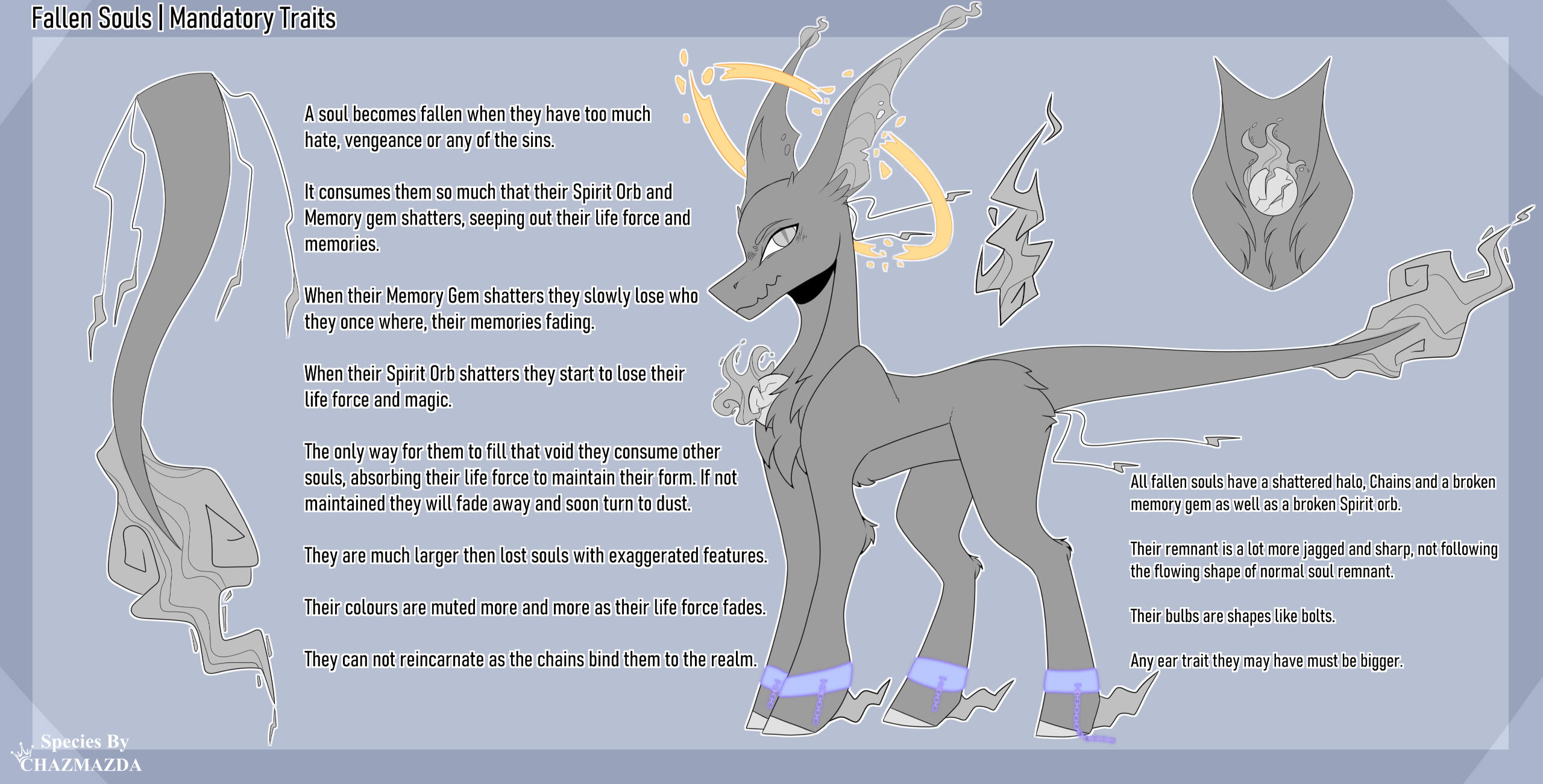・❥・ All their traits looks sharp and jagged.・❥・Their bulbs are pointed like little bolts.・❥・Their halos are always broken.・❥・Gems must be cracked to be a fallen.・❥・Soul chains are mandatory.・❥・They can have any ear trait, it just needs to look bigger.Traits