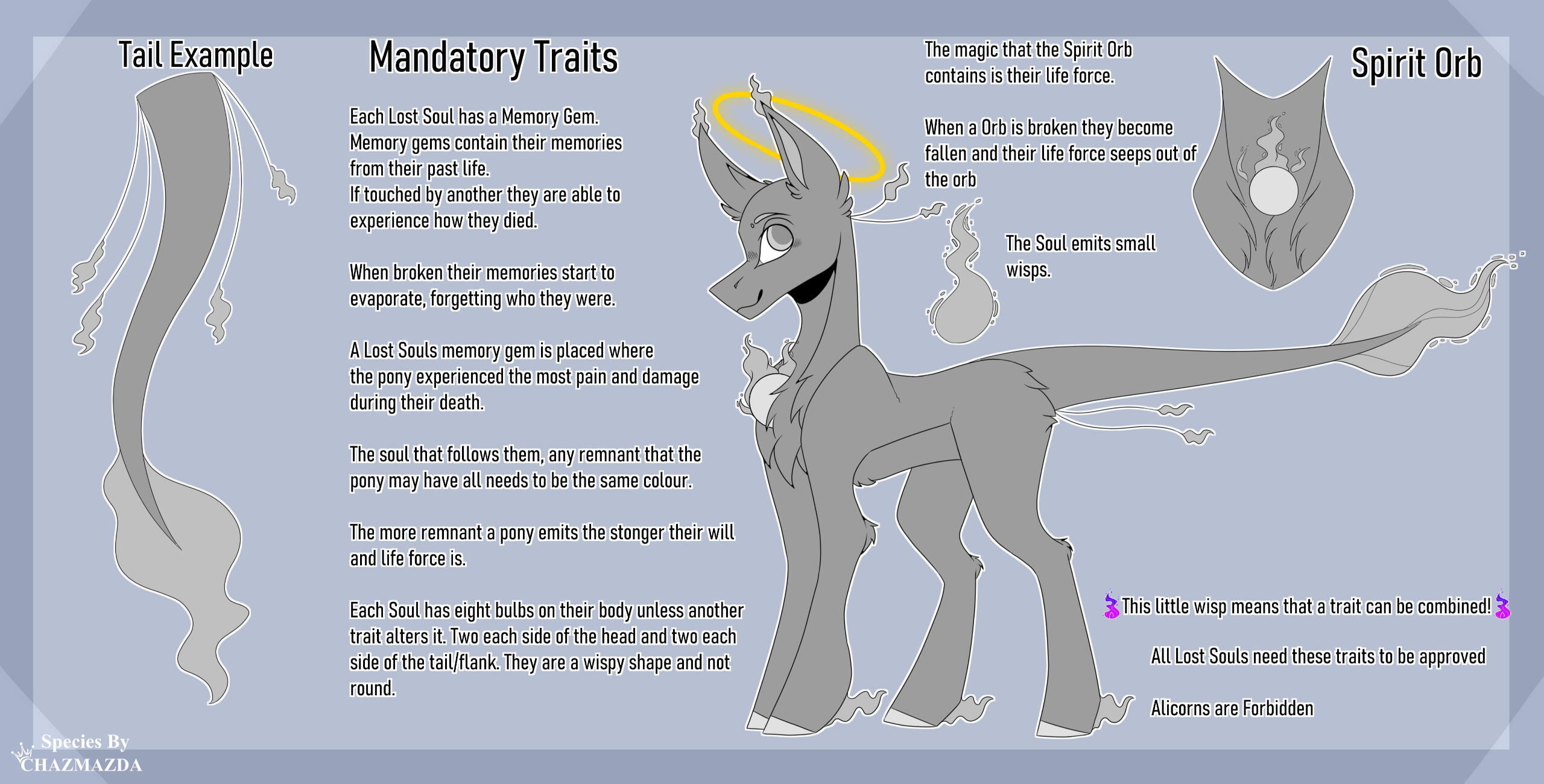 ・❥・Their life force is contained within their spirit orb.・❥・Their memories of their past life is contained within their memory gem, if touched another pony can see how they died.・❥・A memory gem can be placed anywhere on the body where the pony took the most pain and damage during death.・❥・The soul follows them where ever they go and is almost always located above their back.・❥・Each soul has a total of eight bulbs on their body, two either side of the head and two either side of their flank/Tail. They are a wispy shape.・❥・Each bit of remnant they emit MUST be wispy, tails must be drawn wispy and NOT like hair.・❥・All souls need these traits to be considered a lost soul.・❥・ALICORNS ARE FORBIDDEN!