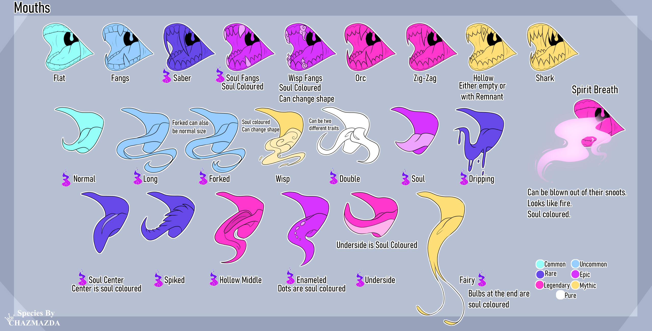 ・❥・Smoke breath is the colour of the soul.・❥・The fairy tongue has a bit on the end that the souls can move at will. The little bulbs at the tip are soul coloured and glow.・❥・With the Enameled tongue the spots of the tongue are soul coloured and glows.