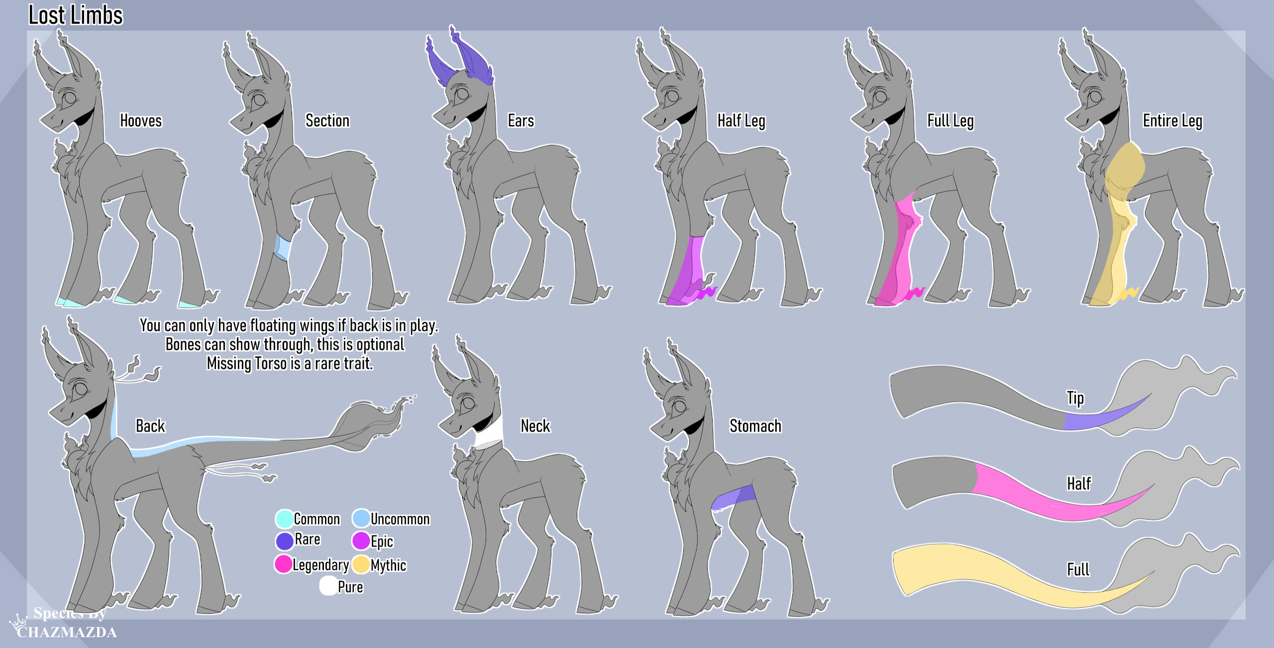 ・❥・Pegasi can not have platforms.・❥・You can mix match front and rear hooves.・❥・Excess Energy emits remnant through the ground from their feet when they walk. It glows.・❥・Raptor claws only appears on the inner hind legs of the pony.