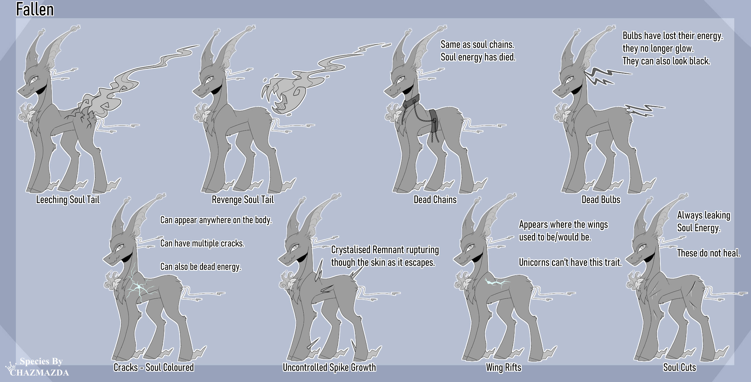 ・❥・ All their traits looks sharp and jagged.・❥・Their bulbs are pointed like little bolts.・❥・Their halos are always broken.・❥・Gems must be cracked to be a fallen.・❥・Soul chains are mandatory.・❥・They can have any ear trait, it just needs to look bigger.Traits